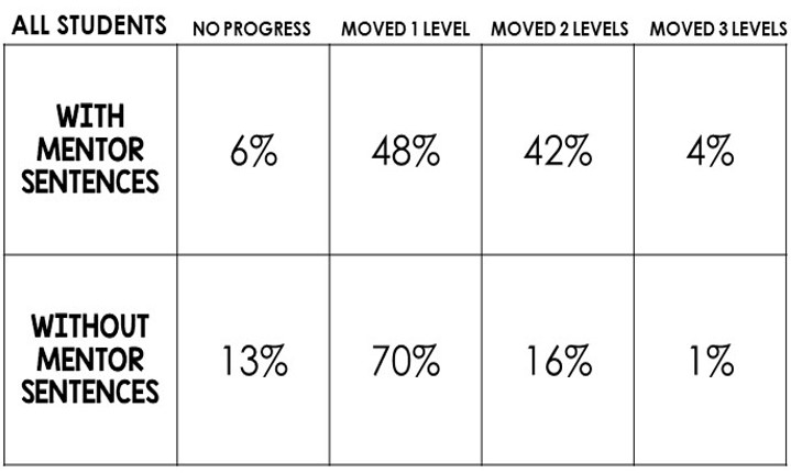 •There was a 27% increase in the number of highly effective students using mentor sentences in the area of grammar. This is 15% higher than the growth of highly effective students who were not using mentor sentences. There was a 52% increase in the number of effective AND highly effective students using mentor sentences in the area of grammar. This is 21% higher than the growth of effective AND highly effective students who were not using mentor sentences.