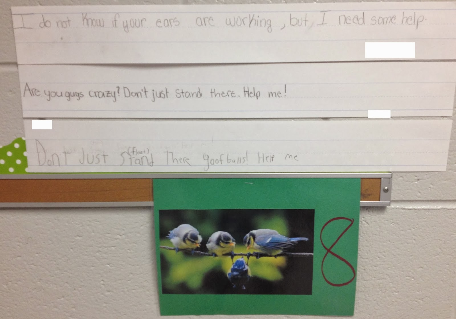 I posted eight pictures around the room, similar to the one above. They walked around with their writing journals and came up with a caption for all of them. I floated from picture to picture and chose a few of the best/funniest for each picture (making sure that all of my students had one to share). They wrote their caption on a sentence strip, which are now proudly on display in the hall with the pictures! Here are some of my faves: