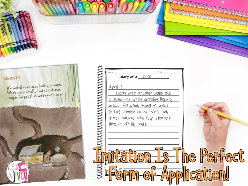 In the mentor sentence routine, the day for imitation allows for application in a very manageable way. Students write a sentence of their own that follows the style and structure of the author… but then remember: they also need to expand this practice into their own writing!